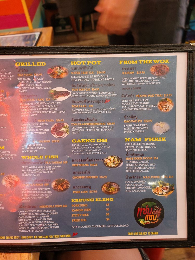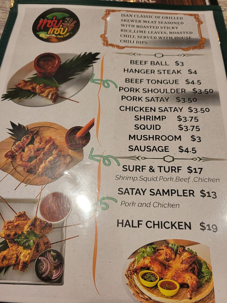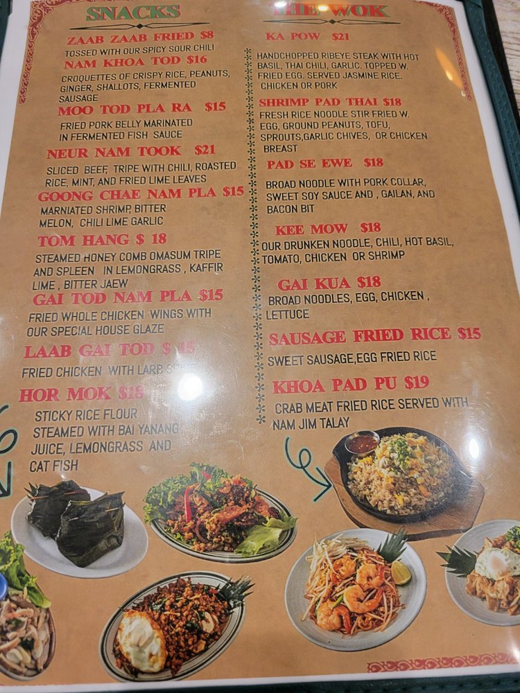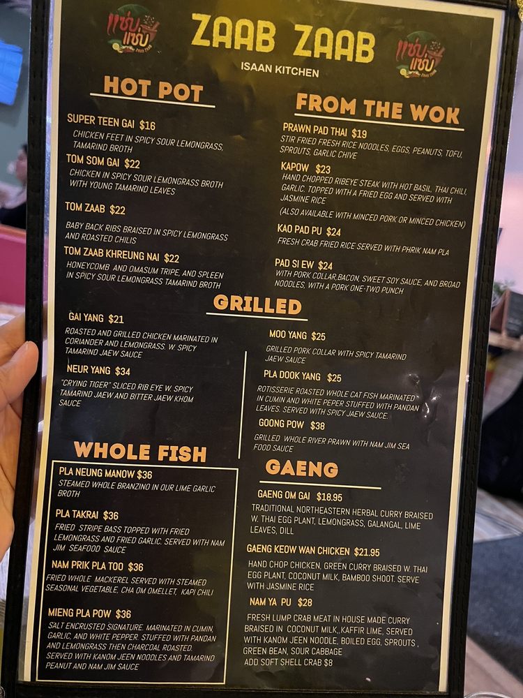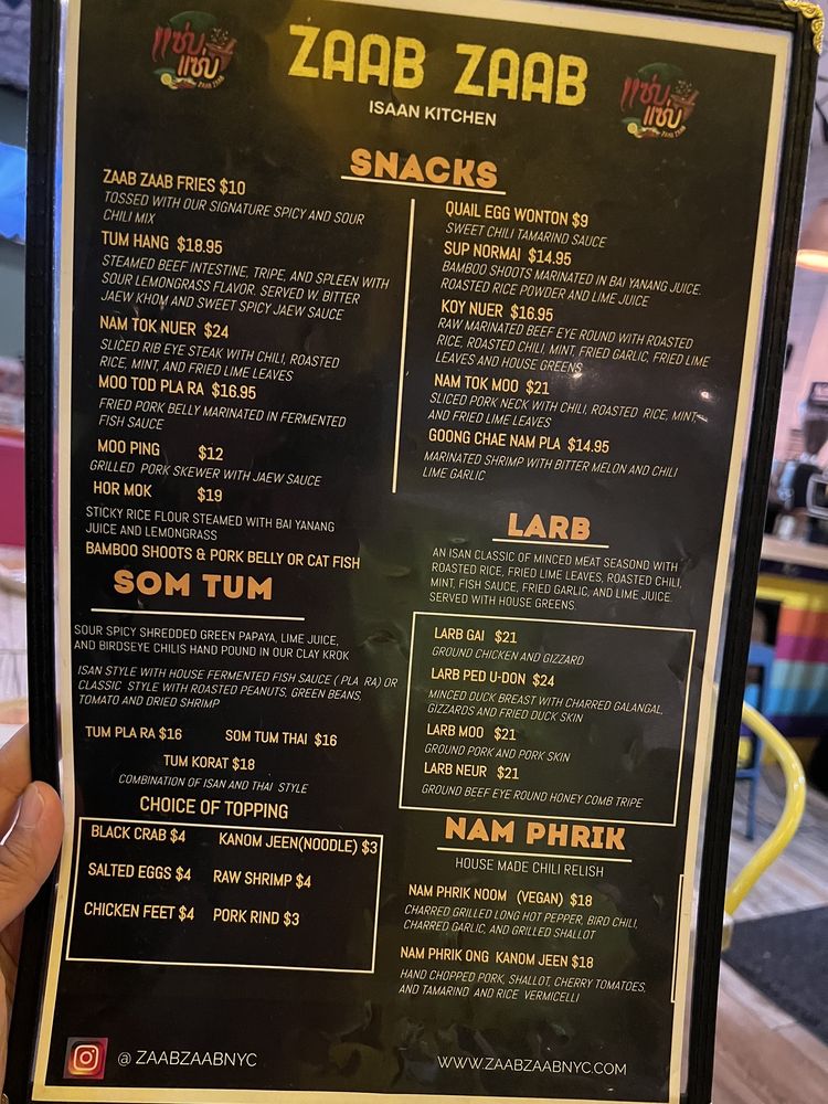 Zaab Zaab, a Thai seafood restaurant located in Elmhurst, NY, offers a unique dining experience with dishes from northeast Thailand. The menu boasts a delightful mix of flavors and spices, with standout dishes like the Tom Hang, Nan Khao Tod, Surf and Turf skewers, and the salt-baked fish. Customers rave about the attentive service and fresh, flavorful food. The vibrant and welcoming atmosphere sets the stage for a memorable meal. The restaurant's authenticity and attention to detail make it a must-visit for any food lover seeking a true Thai culinary experience. Don't miss out on the delicious offerings at Zaab Zaab.
