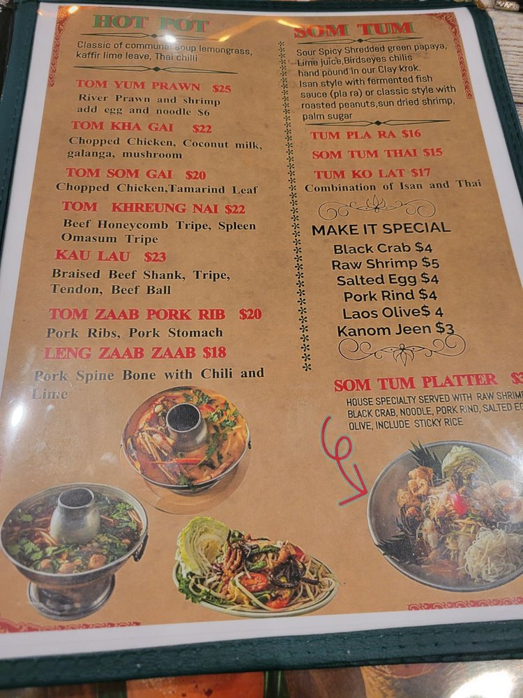 Shredded green papaya, garlic chili limes juice fermented fish sauce with raw shrimp, salted egg, black crab, pork rind, Laos olive, tomatoes, green beans,and kanom jeen (rice noodle) include sticky rice or classic style (som tum Thai) with peanuts and sun dried shrimp